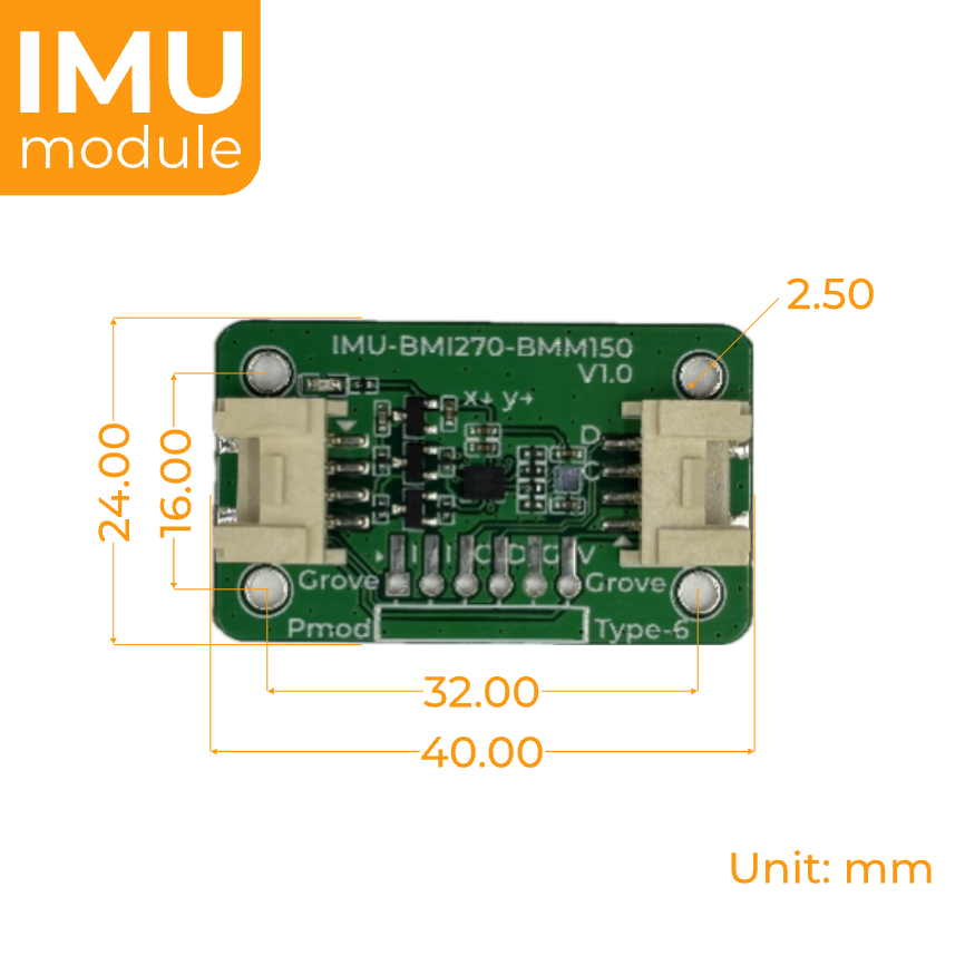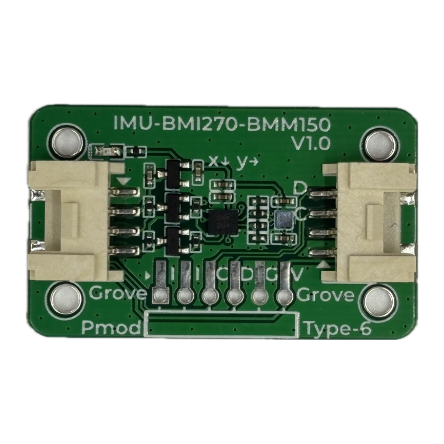 - IMU Module 的 BMI270 和 BMM150 使用级联的方式,主控板通过 I2C 与 BMI270 进行通讯,BMI270再通过 Sensor Hub 驱动 BMM150 进行采集数据。